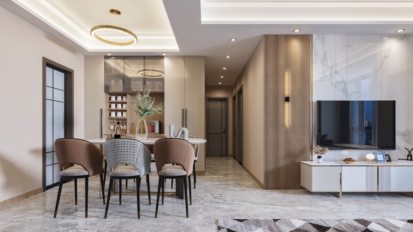 餐廳和客廳背景墻,在背景墻方面使用的是巖板搭配上木格柵接著配合燈光總體采用暖色調,一進家門整體看上去使人感覺到溫馨,家人們和藹可親。